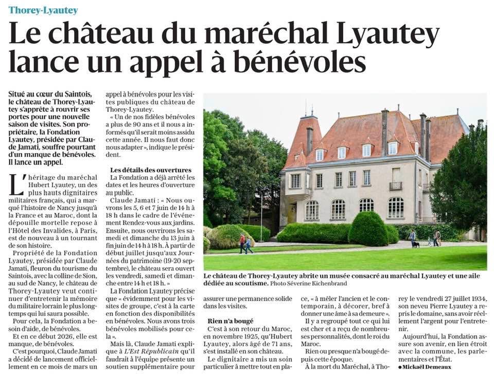 Conférences 19 mars: SMLH (Société des membres de la Légion d’Honneur), Lyon. 24 mars : Cercle Antéis, Paris. 18 mai : AVF (Accueil des villes françaises), Noisy le Roi. 8 juin : SMLH Meurthe et Moselle, au château de Thorey-Lyautey. Cérémonies 7 Mai : Cérémonie d’hommage au maréchal Lyautey et de commémoration de son souvenir aux Invalides à Paris. […]